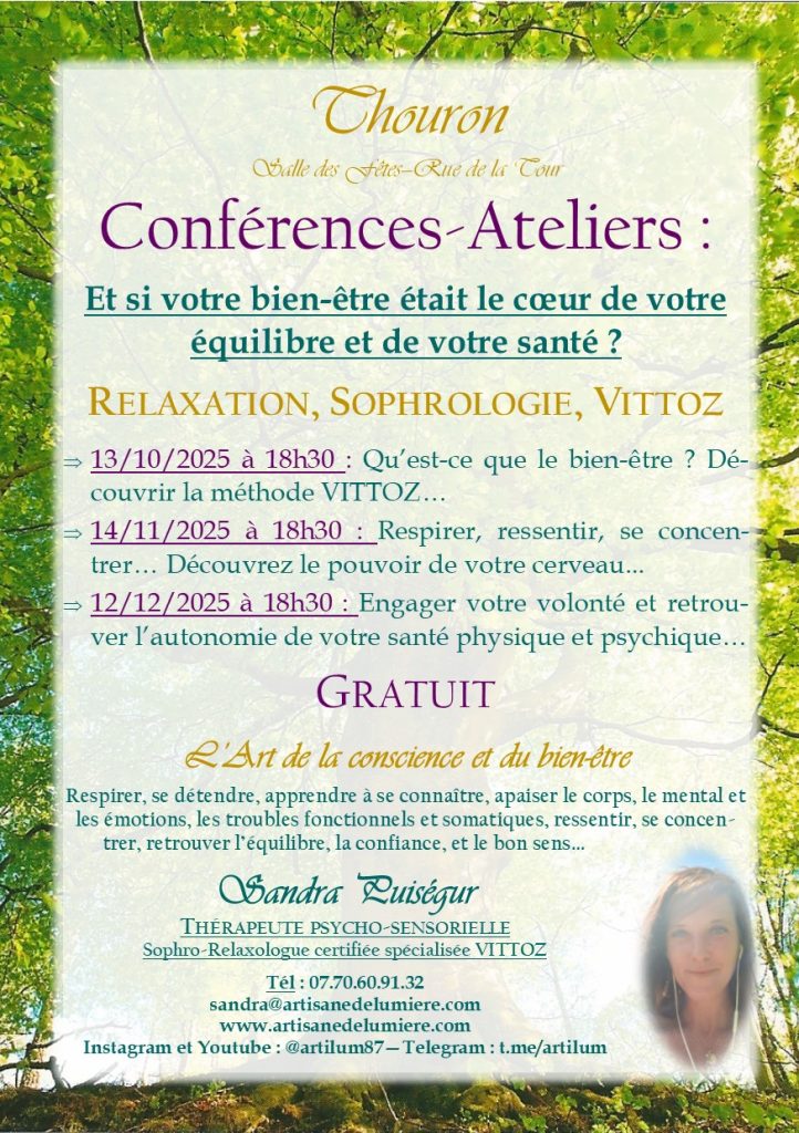La mairie de Thouron m’accueille dans la salle des fête de la ville pour un cycle de 3 conférences/ateliers gratuit sur les mois d’octobre, novembre, décembre autour du bien-être et de la santé, vous trouverez le flyer ci-dessous.