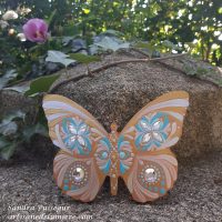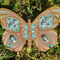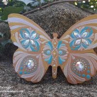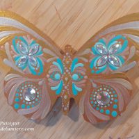 Papillon cuivre/or/argent en bois, peinture acrylique et vernis, 12*9 cm, épaisseur 0,7 cm.