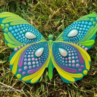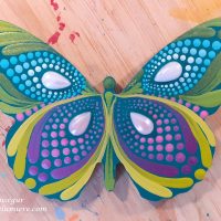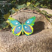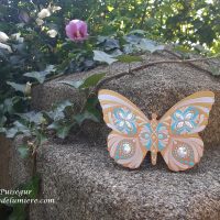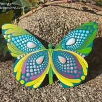 Papillon vert/bleu/rose en bois, peinture acrylique et vernis, 12*9 cm, épaisseur 0,7 cm.