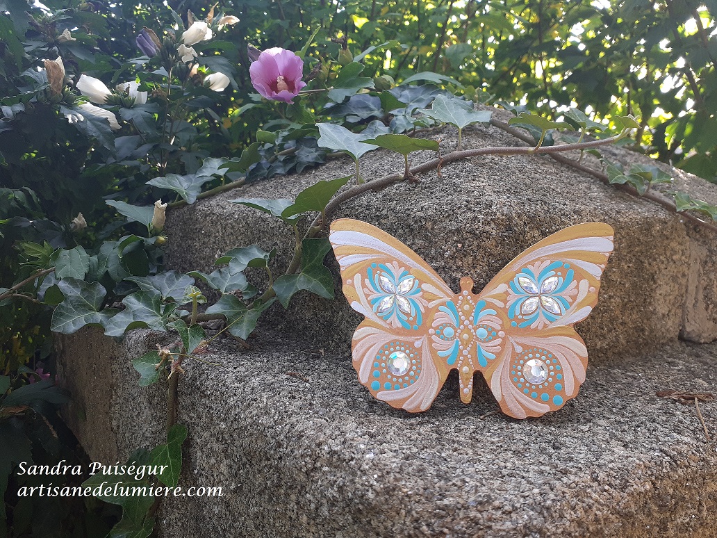 Papillon cuivre/or/argent en bois, peinture acrylique et vernis, 12*9 cm, épaisseur 0,7 cm.