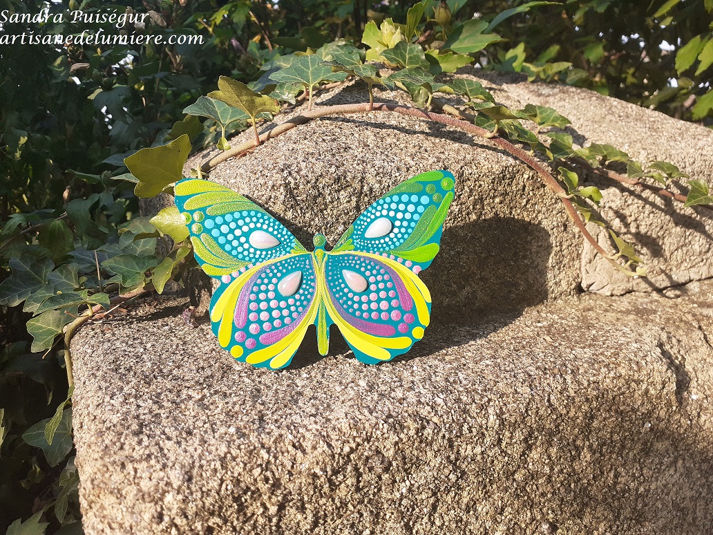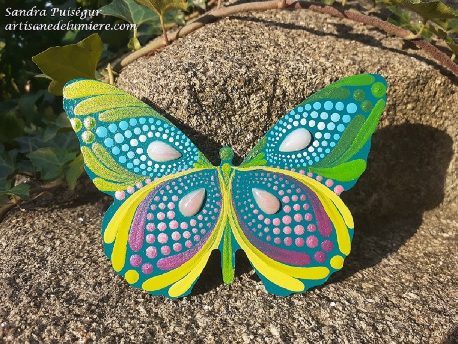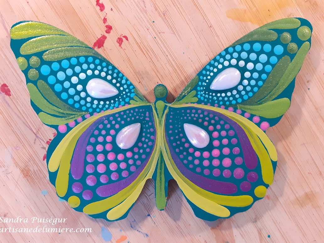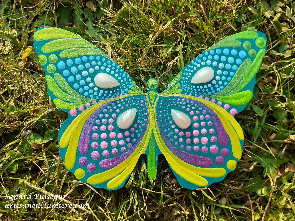 Papillon vert/bleu/rose en bois, peinture acrylique et vernis, 12*9 cm, épaisseur 0,7 cm.